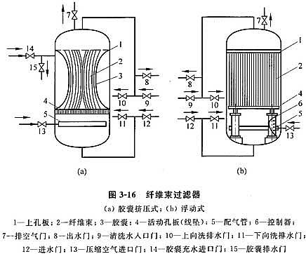 纖維束過濾器有碳鋼和不銹鋼材質,過濾器設備由固定多孔板、活動多孔板、纖維束濾料、布氣裝置等組成。活動多孔板可上下移動,過濾時,在水力作用下,濾料順水流方向空隙由大逐漸變小,纖維密度變大,形成理想的過濾層面,其過濾過程既有縱向深層過濾,又有橫向深層過濾,有效地提高了過濾精度和過濾速度;清洗時,使纖維束達到疏松狀態,同時,采用氣水合洗的方法,在氣泡聚散和水力沖洗過程中,纖維束處于不斷抖動狀態,在水力和上升氣泡的作用下,反沖洗濾料而使其再生。